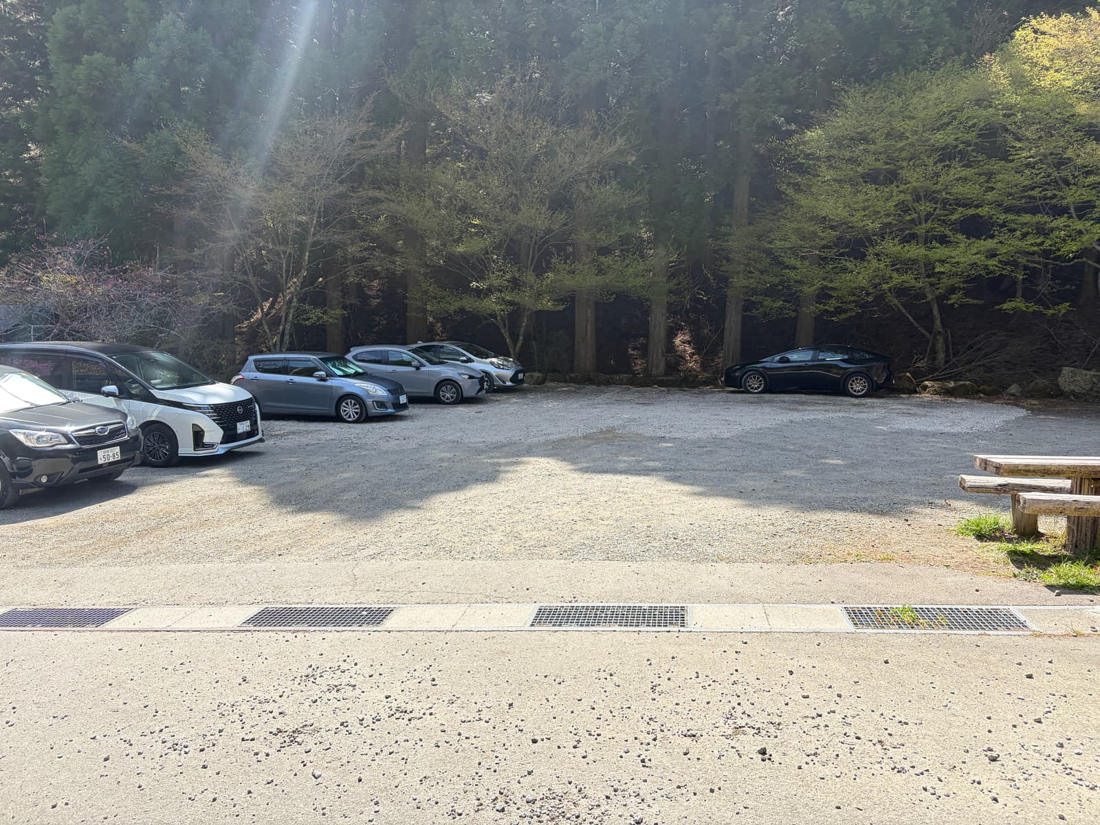 石割神社第一駐車場は、砂利敷きの広めの空き地で、ざっくり30台ほど停められる規模感でした。舗装された大きな観光駐車場というより、登山口の近くにある実用的な駐車スペースという印象です。