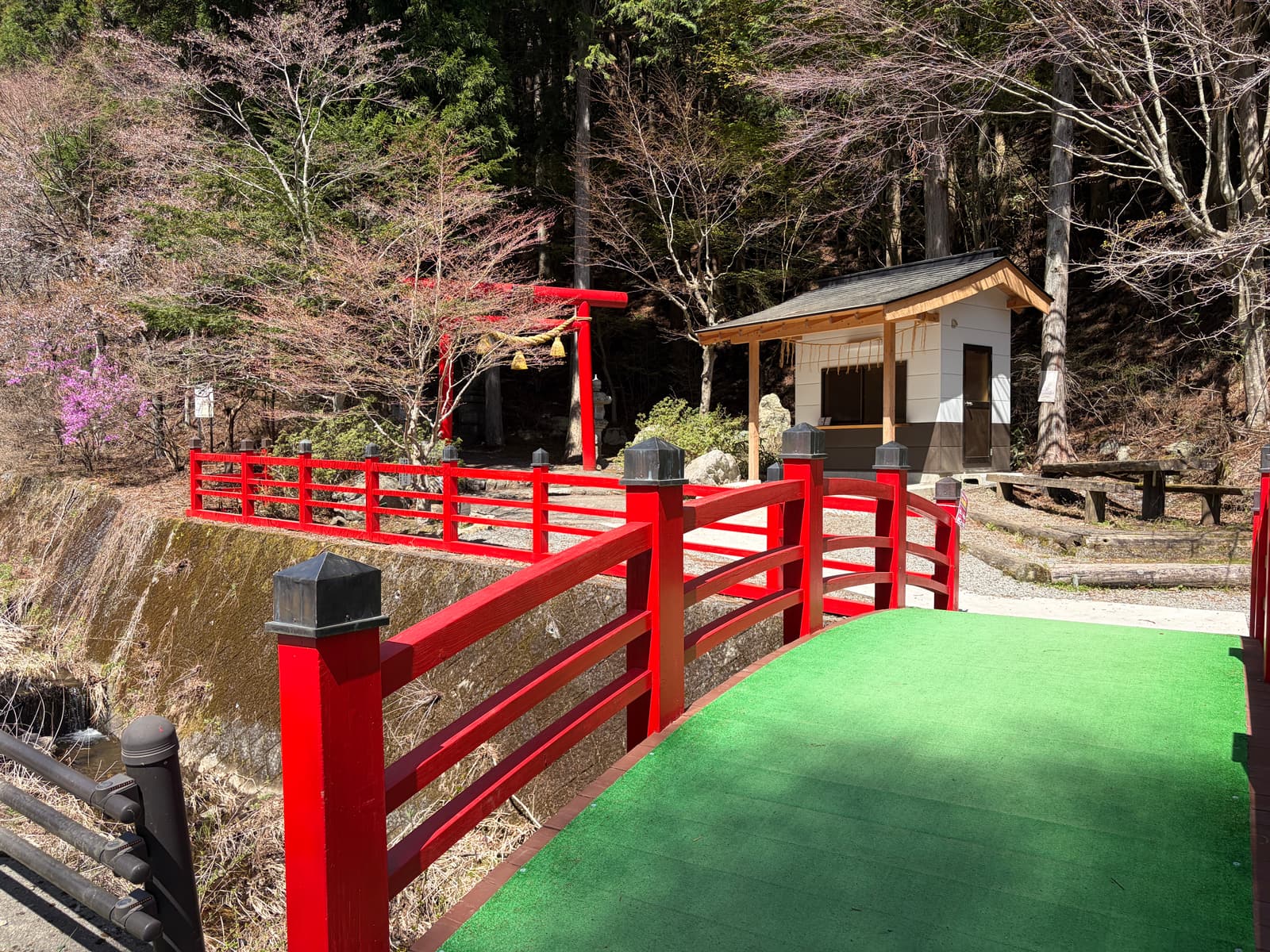 駐車場から登山口まではすぐで、歩き始める前から雰囲気の良さを感じられる場所でした。鮮やかな赤鳥居と赤い橋が目を引き、石割山の登山口らしい特別感があります。
