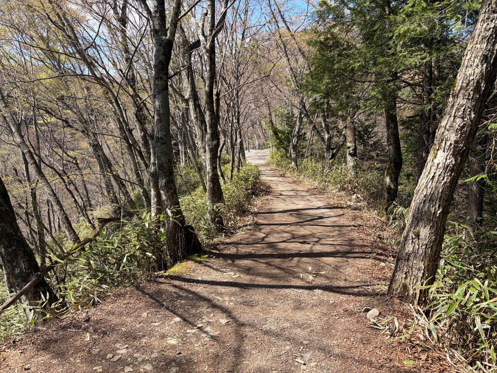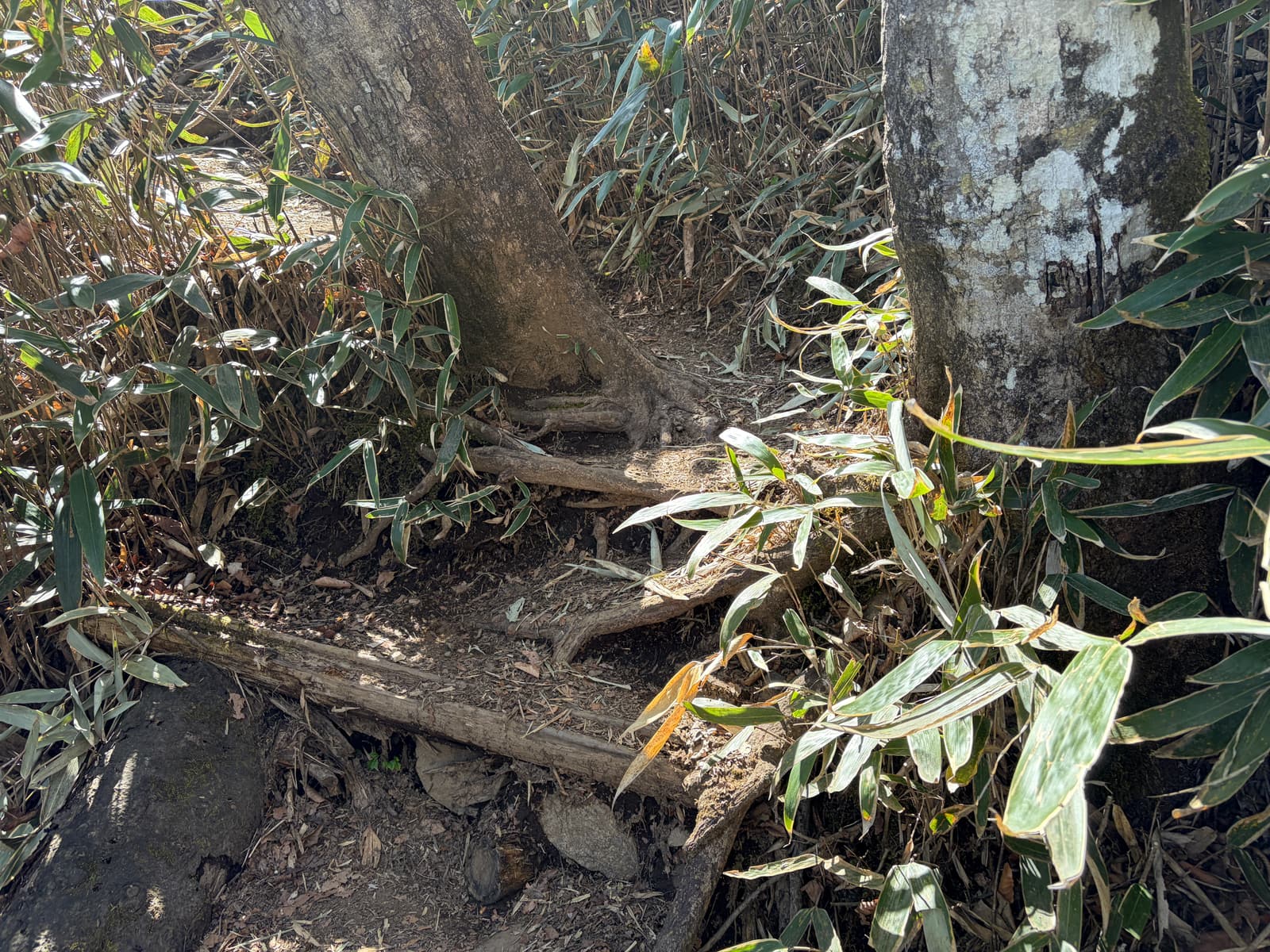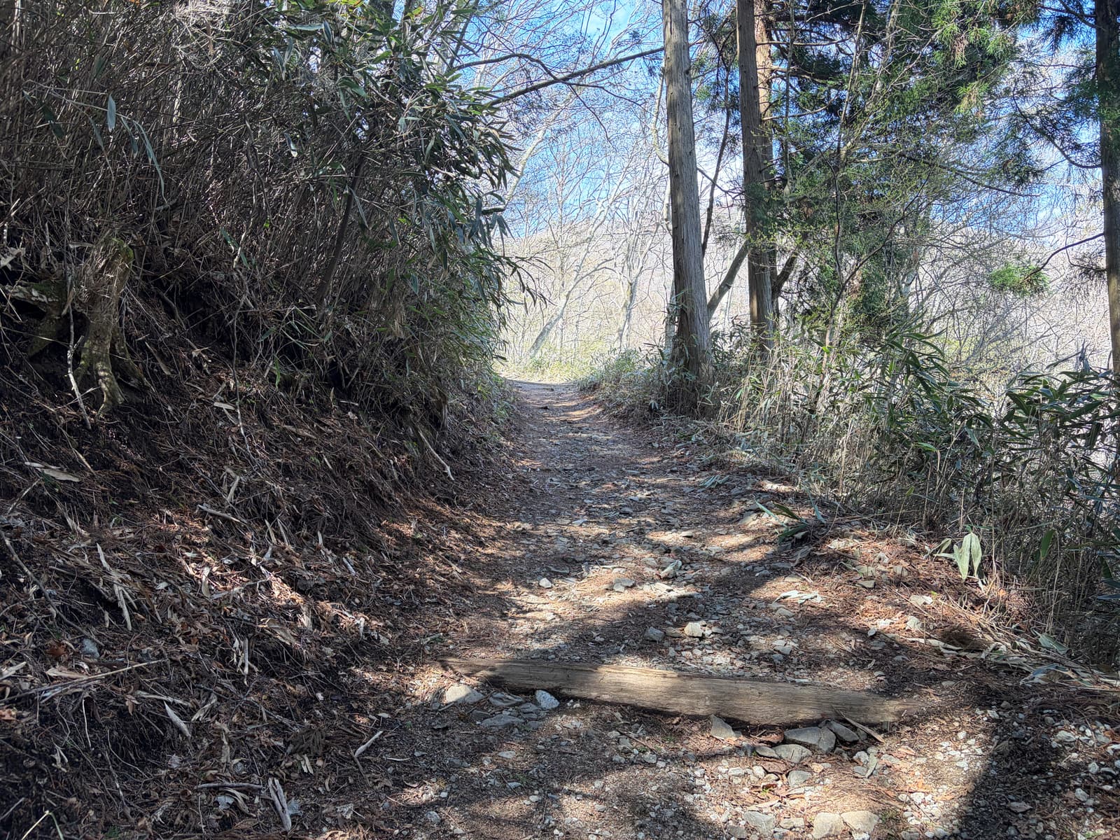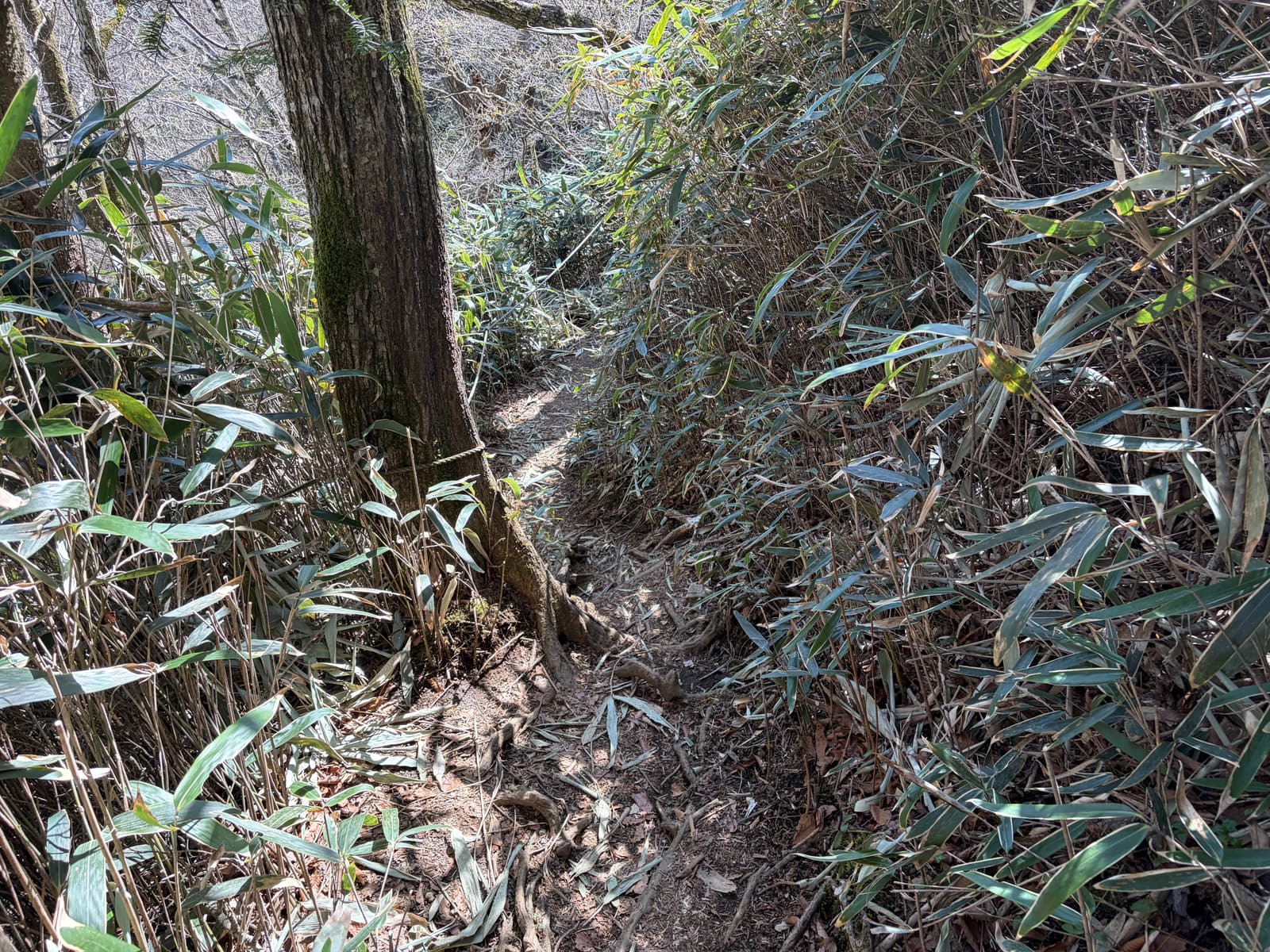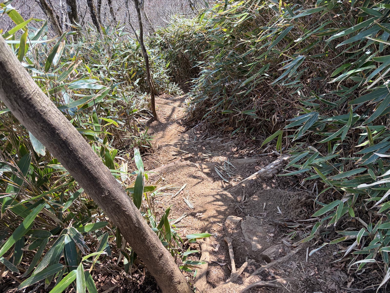 足元は土だけでなく露出した根や段差のある岩が多く、登るにも下るにも気を使います。乾いていても滑りやすさを感じる場所があり、疲れてくると余計にバランスを崩しやすいです。