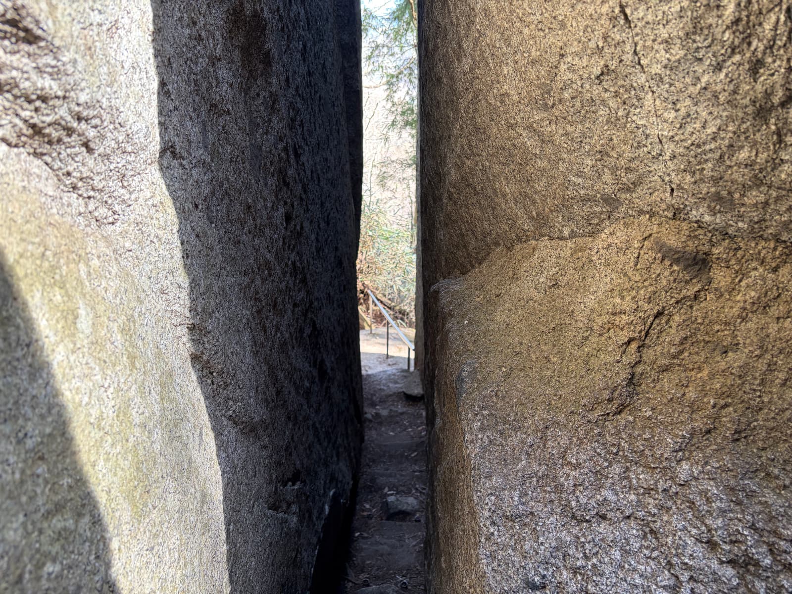ただし、実際に通る隙間はかなり狭いです。写真のとおり身体を横にしないと通りにくい幅なので、ザックを背負ったままだと引っかかりやすく、体格によってはかなり窮屈に感じると思います。無理に入ろうとせず、周囲の人と譲り合いながら慎重に通るのが安心です。