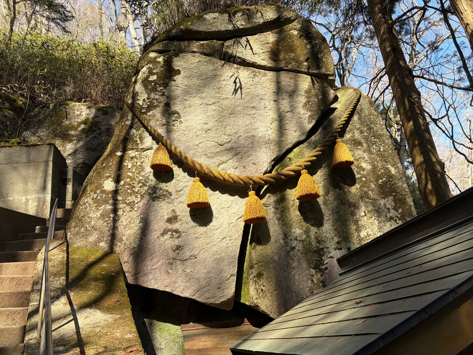 石割神社のいちばんの見どころは、すぐ横にある御神体の巨岩です。大きく割れた岩の裏を3回通ると御利益があるとされていて、石割山らしい体験ができる場所でした。